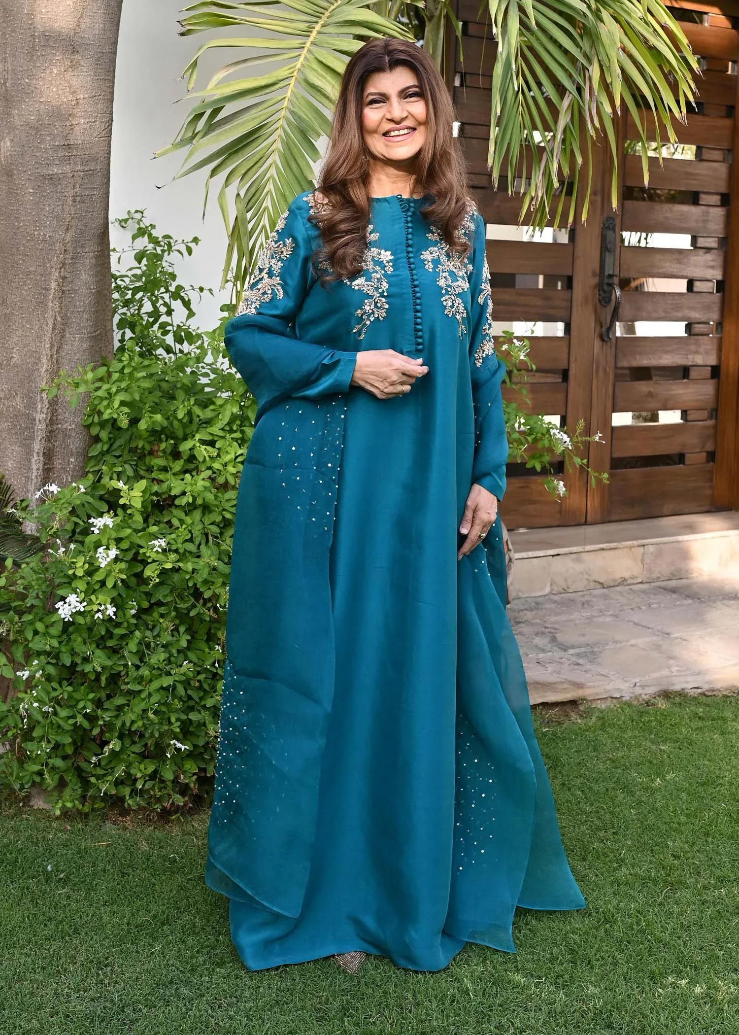 Indulge in refined opulence with Aina by Kanwal Malik, where classic femininity seamlessly meets modern design. Crafted from luxurious pure raw silk, this elegant teal ensemble flows gracefully, complementing the silhouette with effortless sophistication.