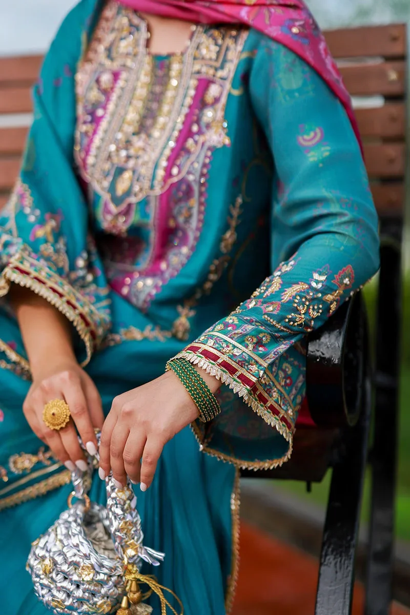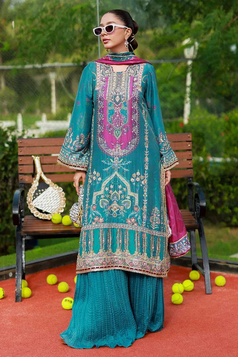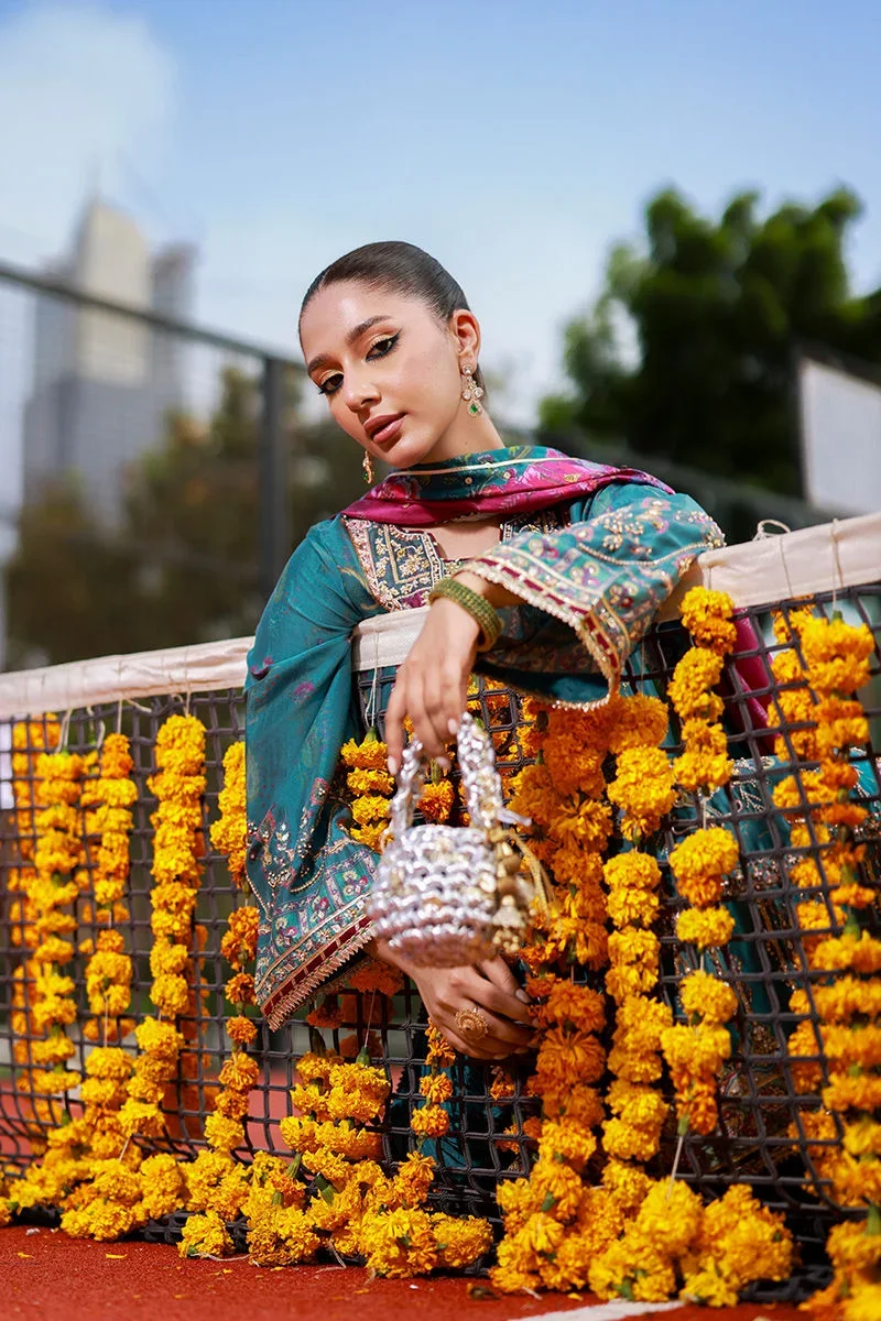 A striking teal printed silk shirt, elevated with contrasting magenta color blocking at the neckline and adorned with exquisite gotta work, sequins, cutdana, and shimmering Swarovski stones. It is paired with a teal medium silk crushed Dhaka for graceful movement and a printed silk dupatta finished with delicate gotta details. A vibrant ensemble that beautifully blends tradition with modern glamour.
