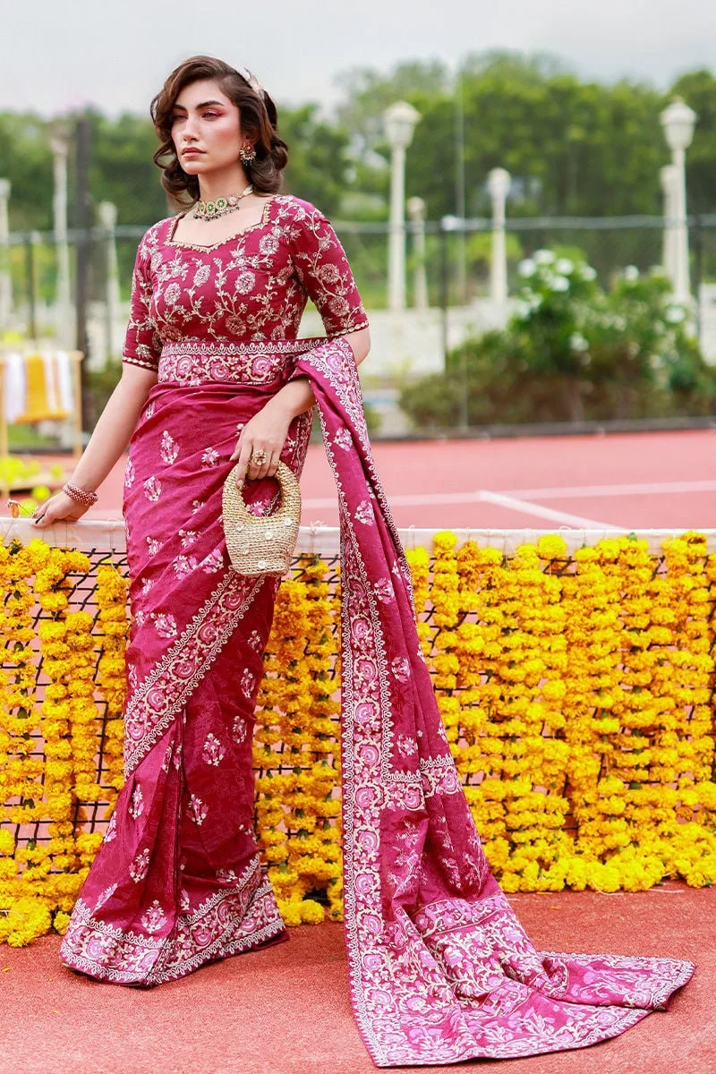 Draped in elegance, this magenta saree is crafted from soft medium silk and adorned with timeless block print detailing. It is paired with a raw silk blouse, hand-embellished to perfection and cut in a flattering sweetheart neckline with short sleeves. The luxurious textures and refined craftsmanship make this ensemble a statement of modern sophistication rooted in tradition.