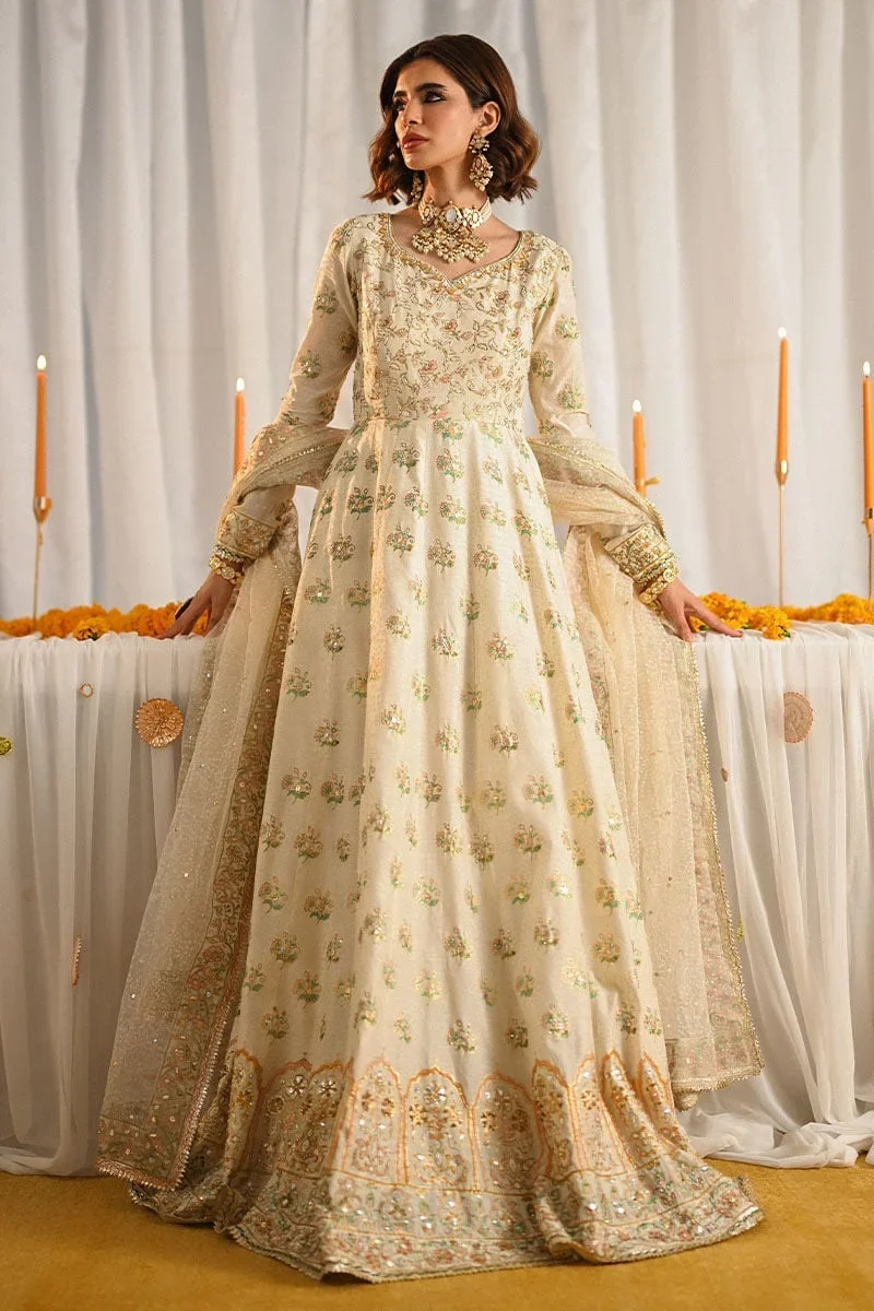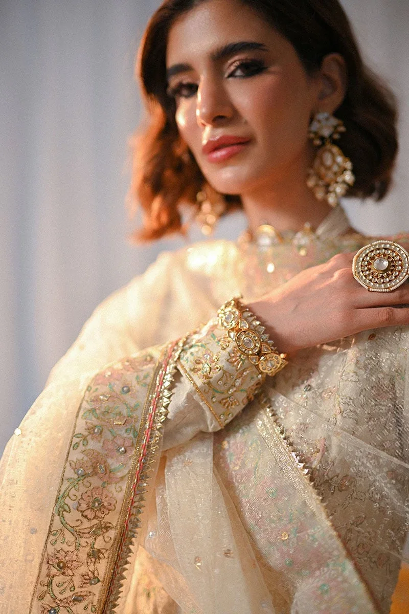 A stunning salmon peach kalidaar dress, meticulously crafted with intricate zardozi embroidery. The delicate floral patterns and shimmering sequins add a touch of elegance and sophistication. Pair with statement jewellery and heels for a glamorous evening look.