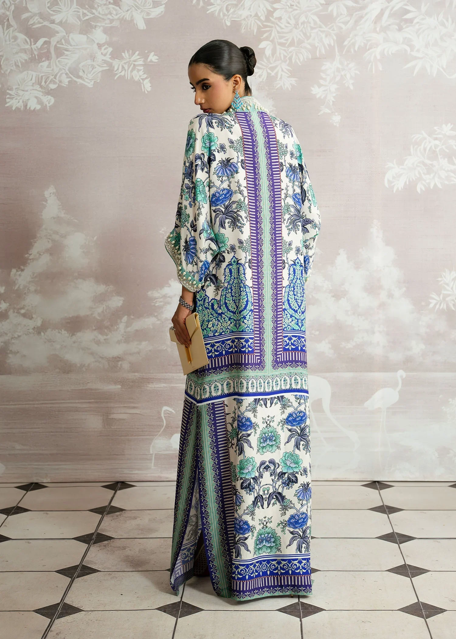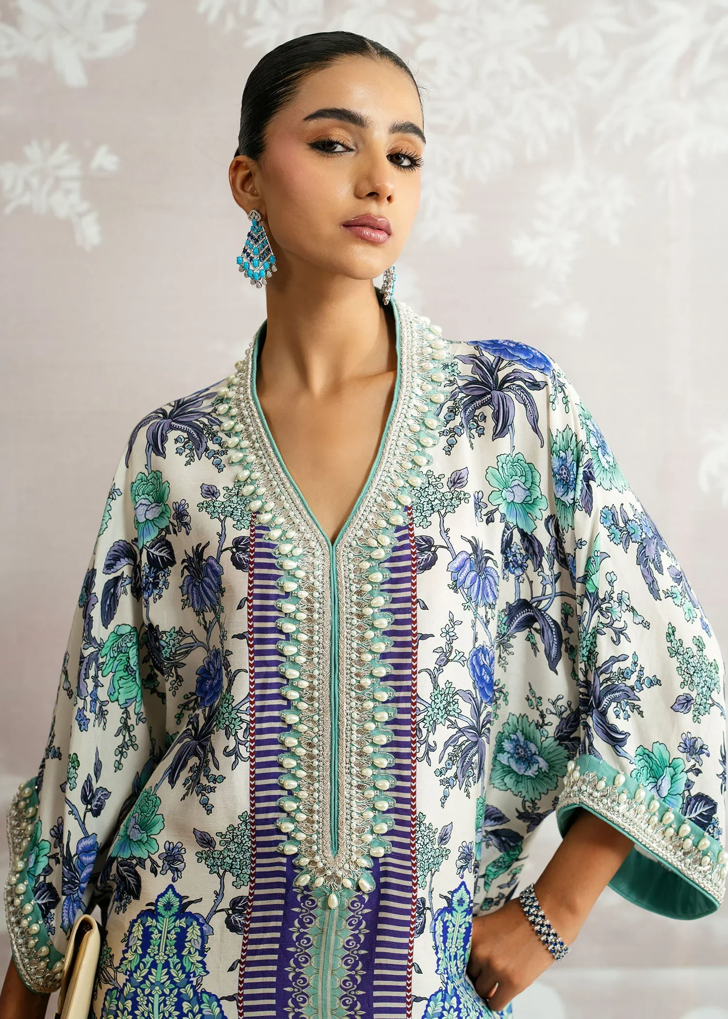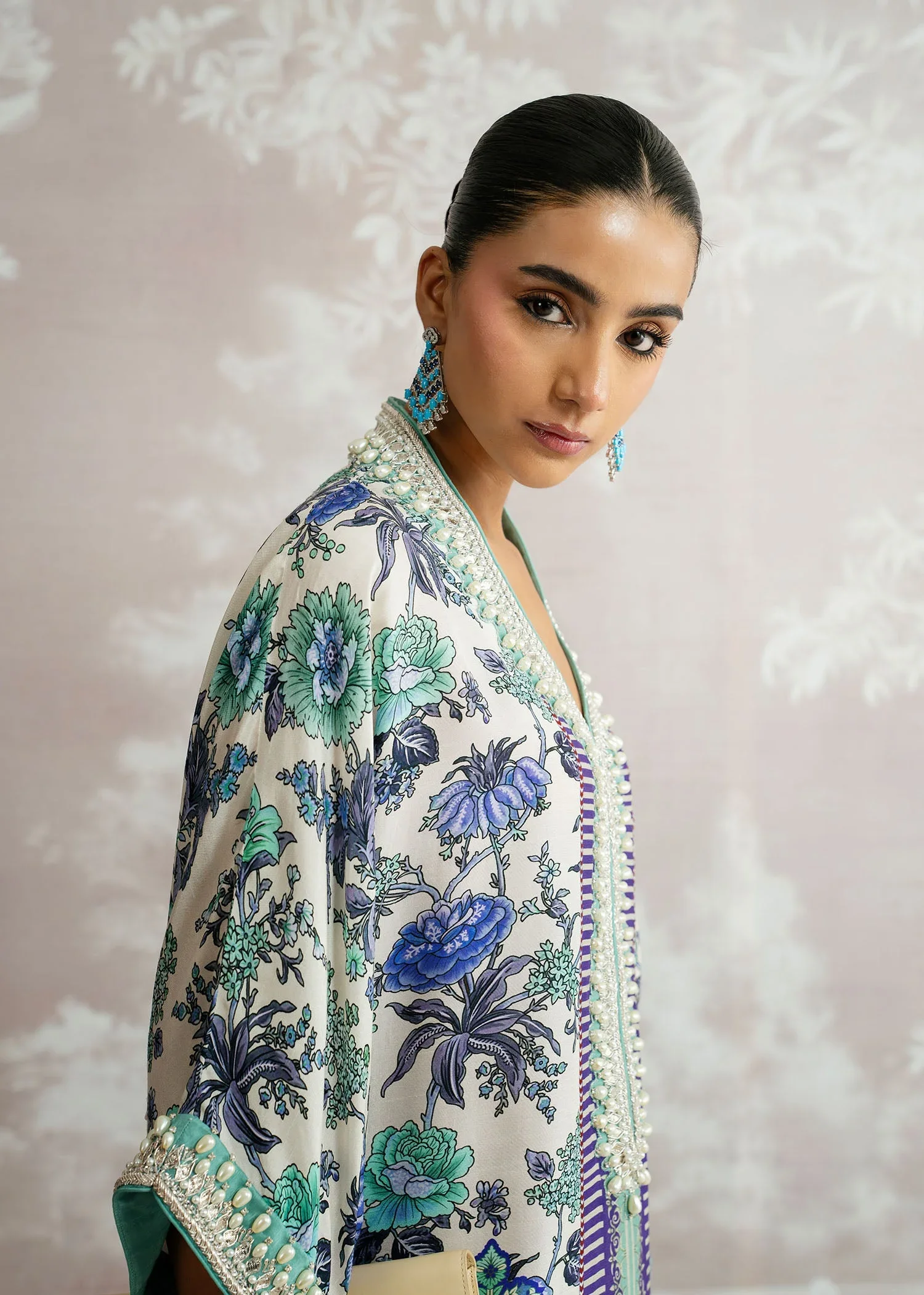 An expression of effortless luxury, Bahar blooms in exquisite printed Korean silk, capturing the essence of refined elegance. The hand-embellished neckline adds a touch of artisanal brilliance, beautifully complemented by a graceful plain spray dupatta. A Luxury Pret ensemble designed to move seamlessly from day to evening, where modern charm meets timeless sophistication.
