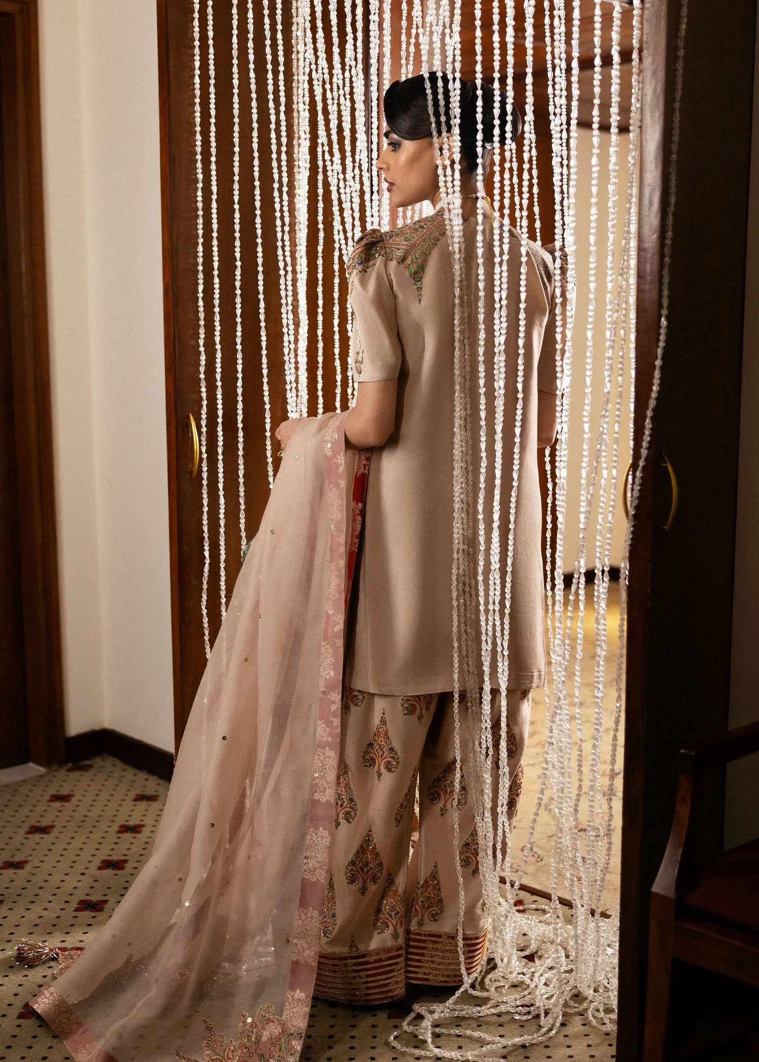 Paired with a beige embellished screen-printed raw silk shalwar, the ensemble is further elevated by a chanderi silk poncha with gotta detailing, introducing a subtle yet striking contrast. A beige organza dupatta, featuring cut-worked corner motifs, completes the outfit with a touch of grace and fluidity. Perfect for festive occasions, family gatherings, or evening celebrations, Buff blends luxury, craftsmanship, and versatility in a statement-making ensemble.