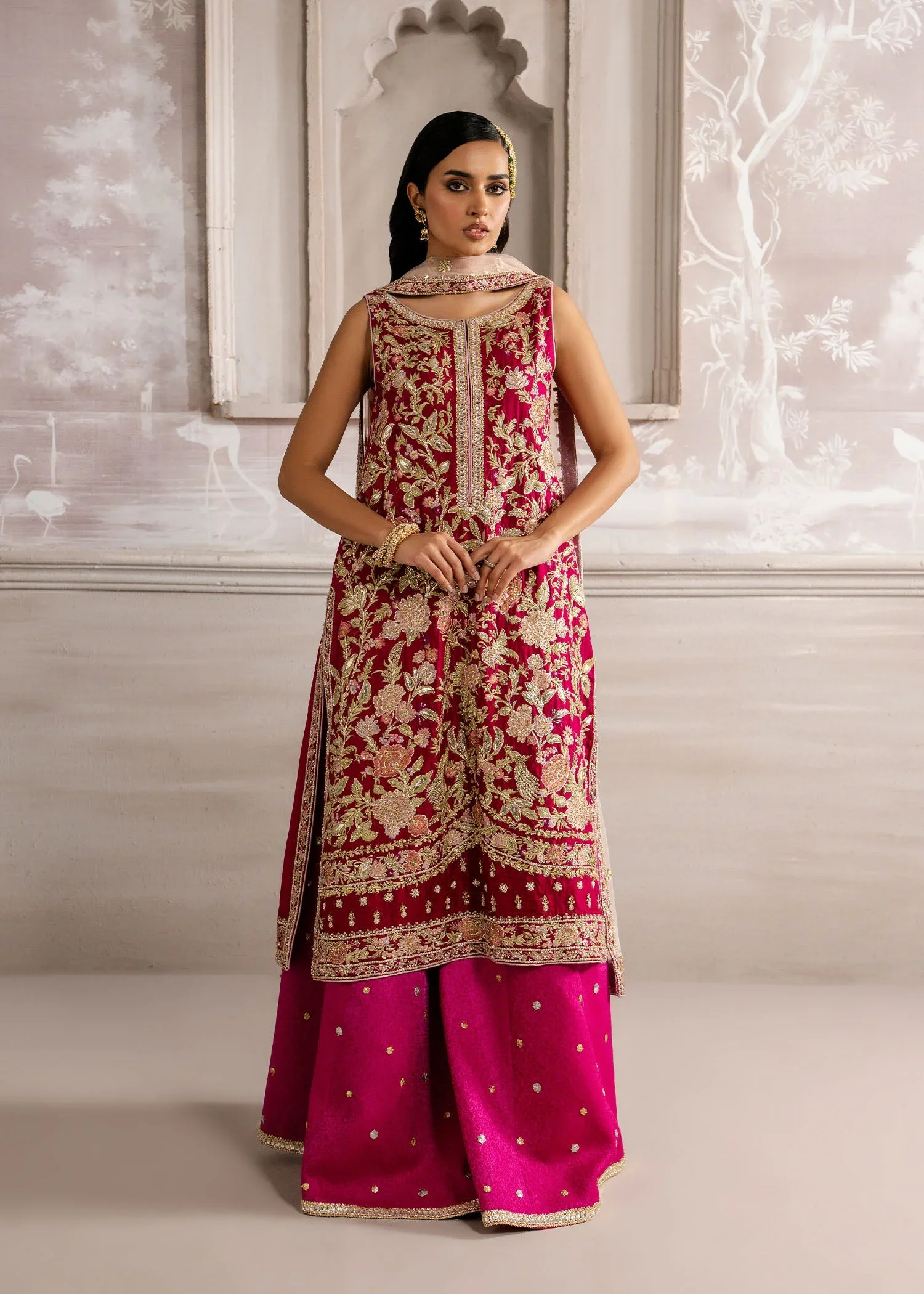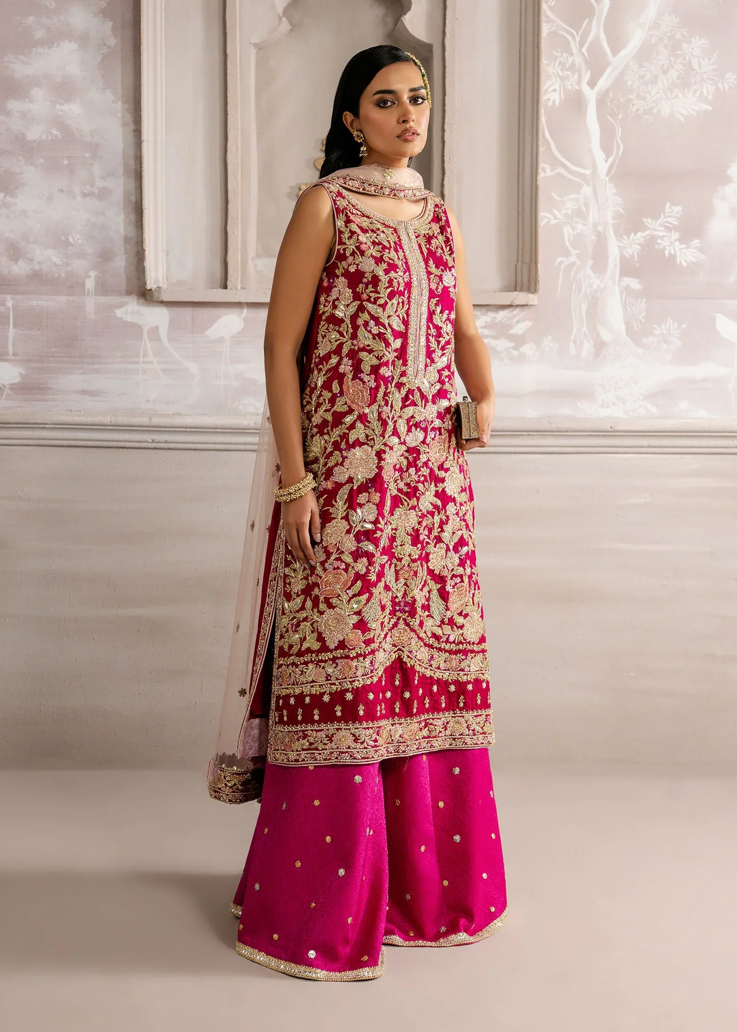 In a striking blend of red and pink, Crimson Garden exudes vibrant elegance and contemporary flair. The jamawar long shirt paired with matching jamawar trousers creates a regal and structured silhouette, while the net dupatta options — as shown, plain, or spray — allow for versatile styling and graceful layering. A look designed to radiate modern sophistication with a touch of luxe charm.