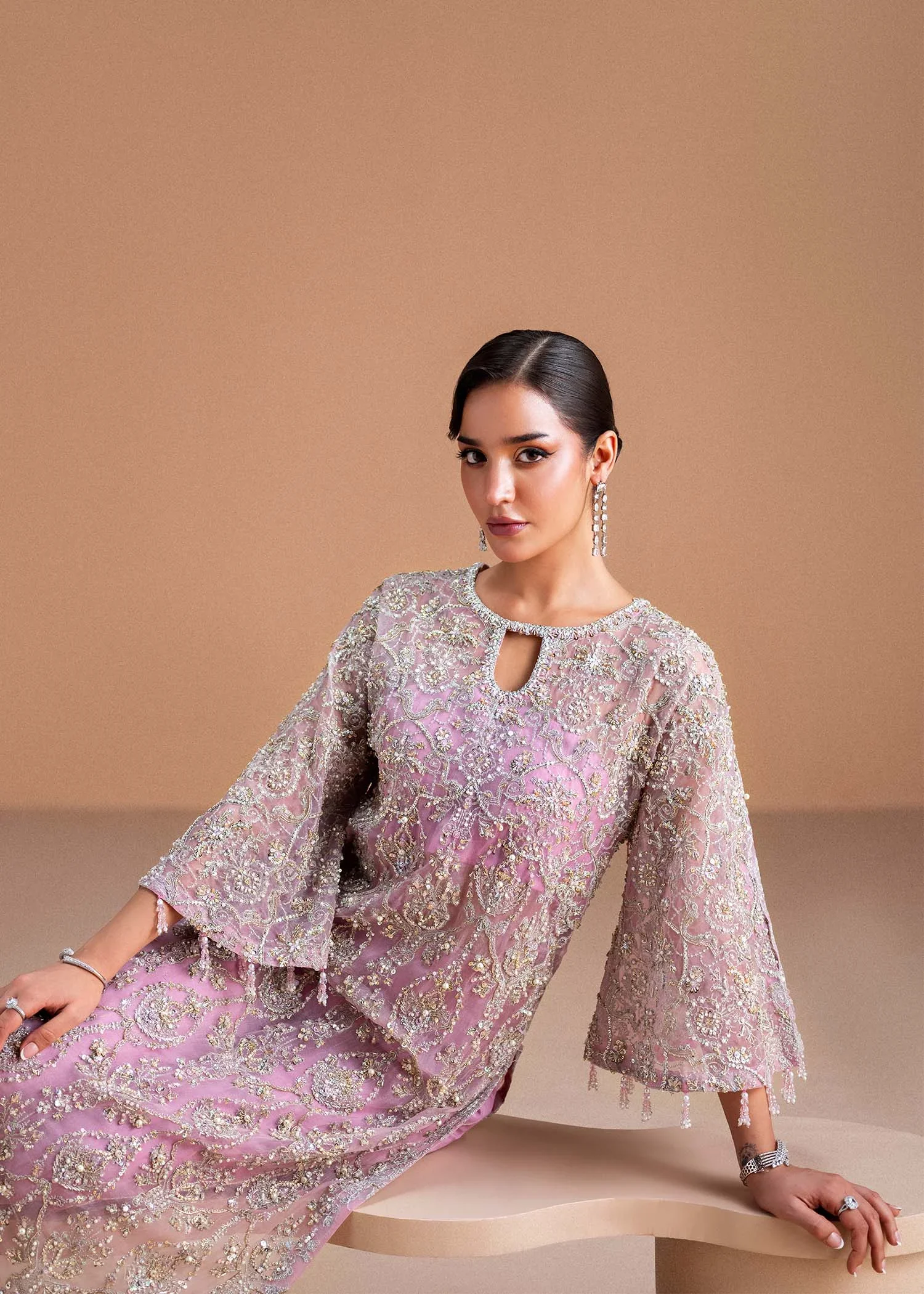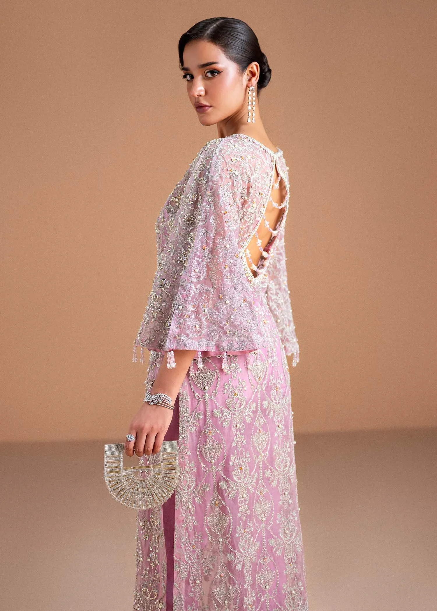 Embrace timeless elegance with the Dina Orchid Ensemble by Kanwal Malik, a refined statement of luxury and modern sophistication. The Kathan organza shirt is fully embroidered and delicately hand-embellished, creating a graceful, couture-inspired look. The design is elevated with slit bell sleeves, adding a soft, flowing flair that enhances movement and femininity.