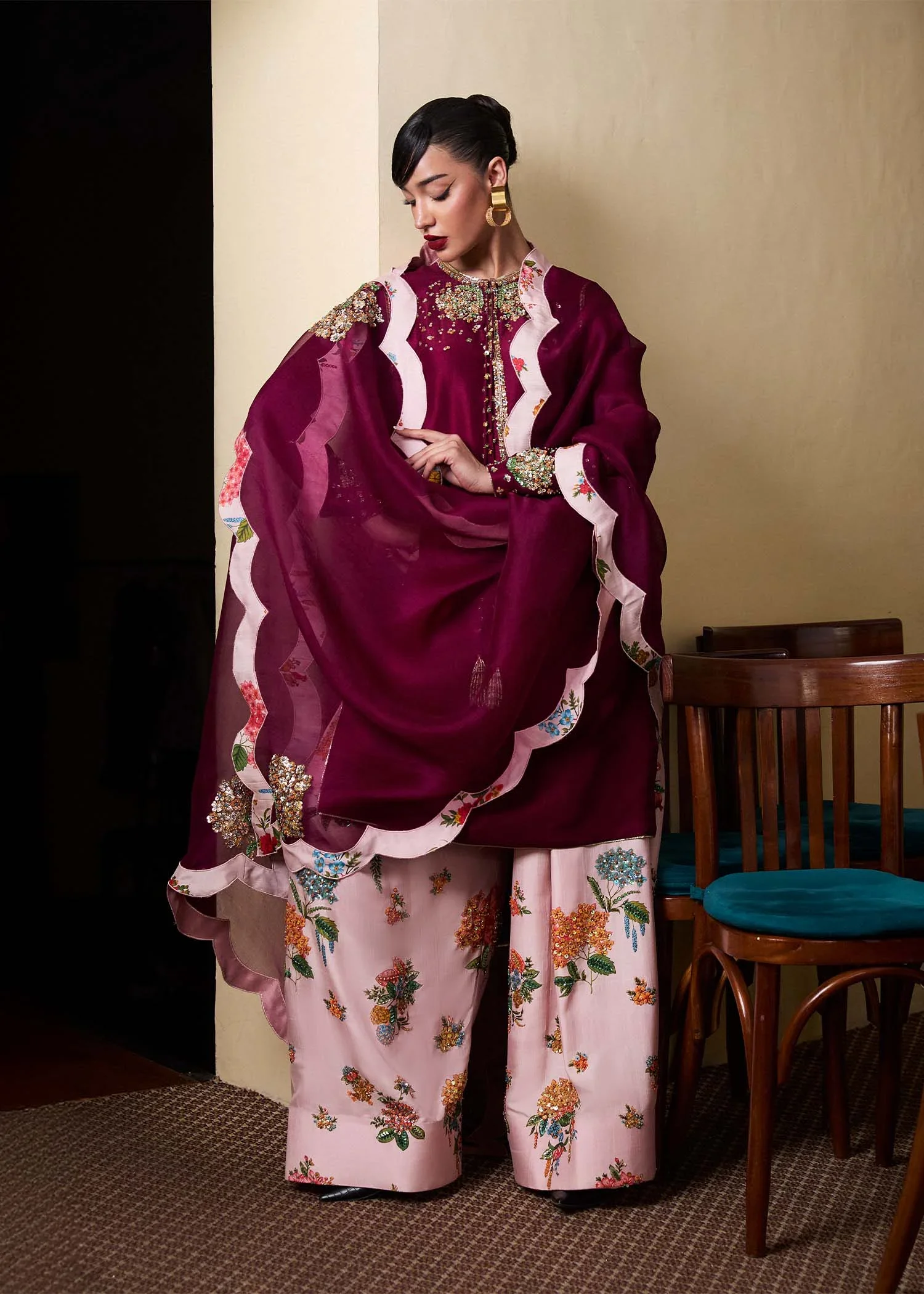 The digitally printed pastel pink shalwar is elevated with intricate hand embellishments, creating a beautiful contrast against the deeper plum tone. Completing the ensemble is a lightweight organza dupatta, finished with elegant scalloped edges and refined prints that add movement and grace to the overall look.