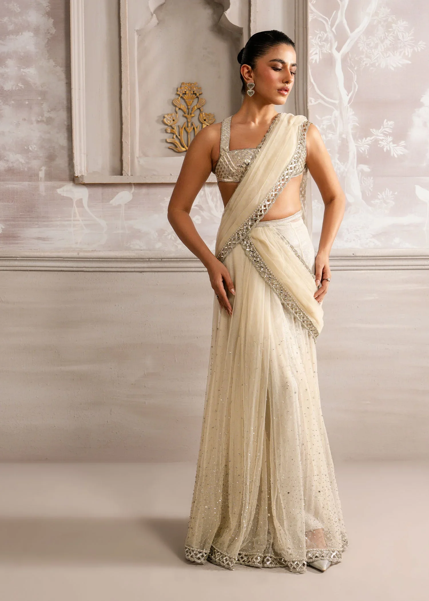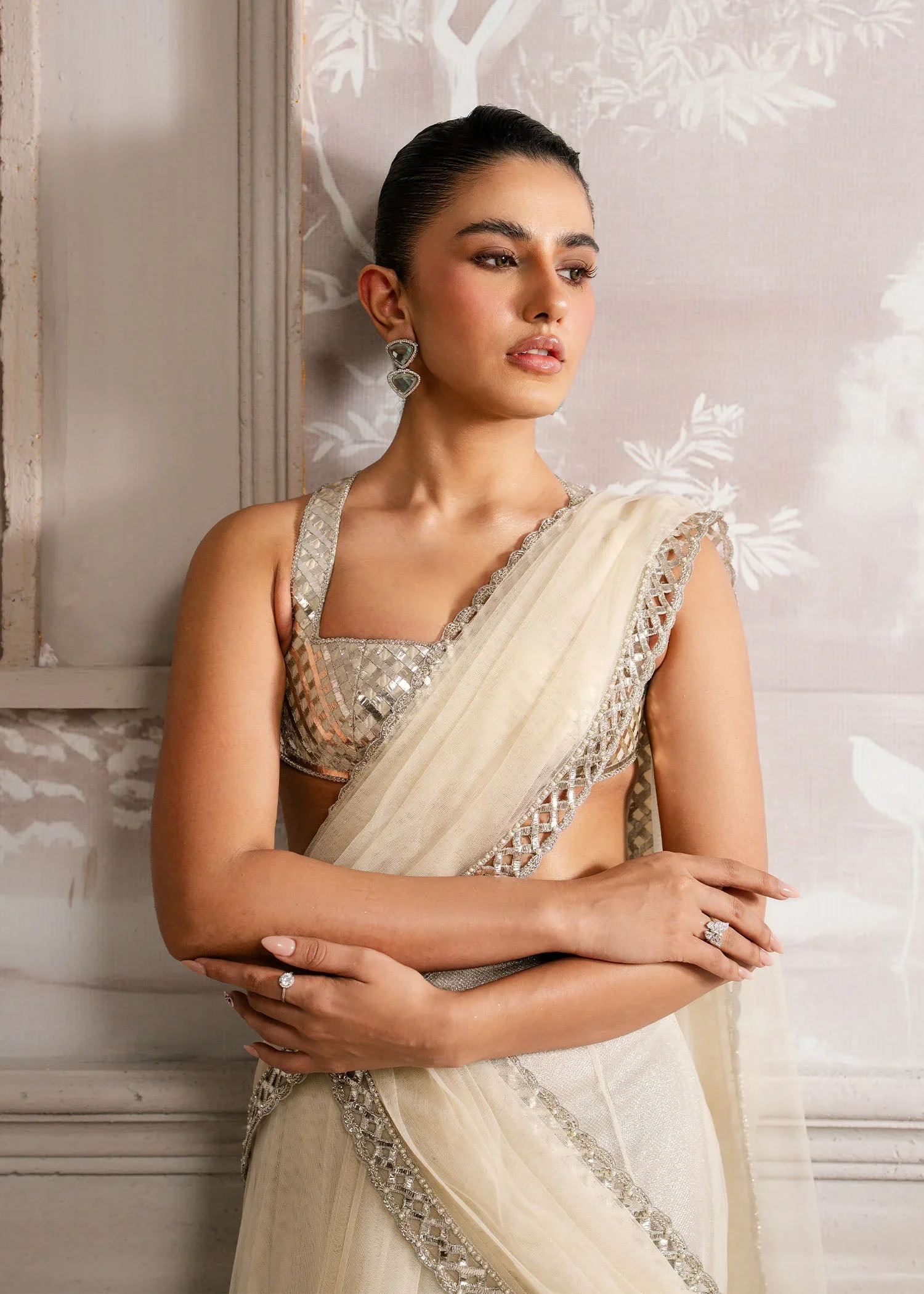 In a sophisticated blend of ivory and silver, Ivory Jewel radiates timeless elegance and refined charm. Crafted in delicate net and elevated with exquisite handworked embellishments, the saree flows gracefully, paired with a tassel silk blouse that adds texture and sophistication. Designed for effortless draping and contemporary grace, this ensemble is perfect for occasions that call for understated luxury with a modern twist, highlighting the artistry of intricate work.