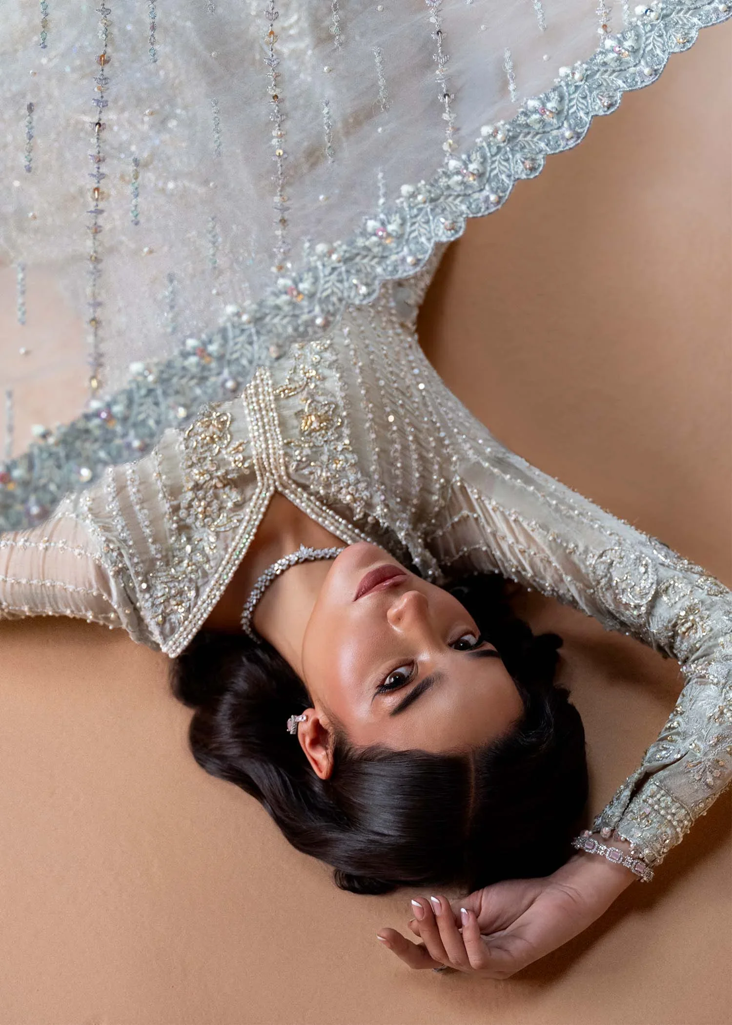 Paired with coordinating tissue flared pants, enhanced with a soft gradient spray effect, the ensemble strikes a perfect balance between contemporary sophistication and classic charm. A sheer Kathan organza dupatta completes the look, adding lightness and fluid movement. Ideal for festive soirées, weddings, and formal celebrations, Mahira is a statement of elevated craftsmanship and elegance.