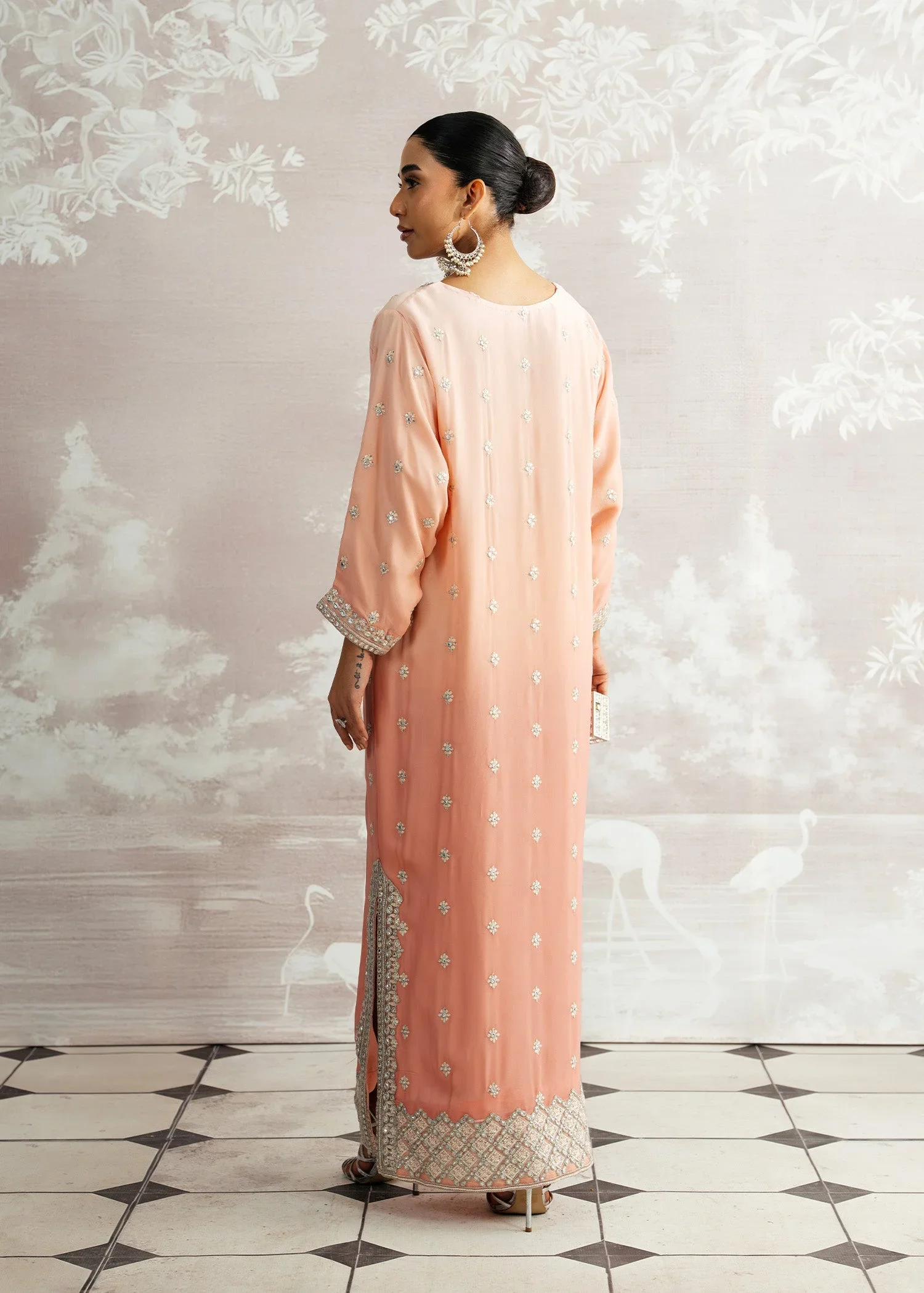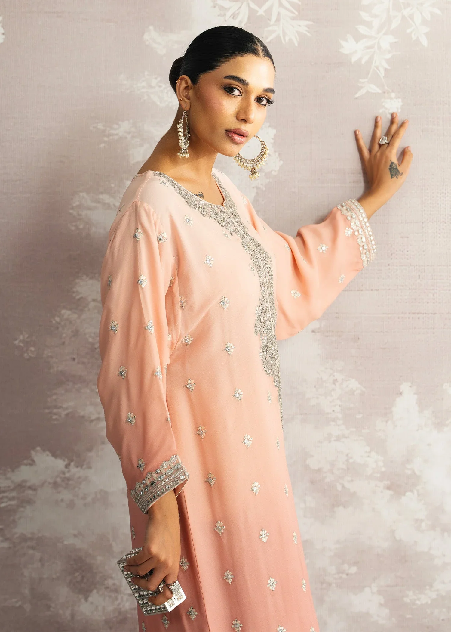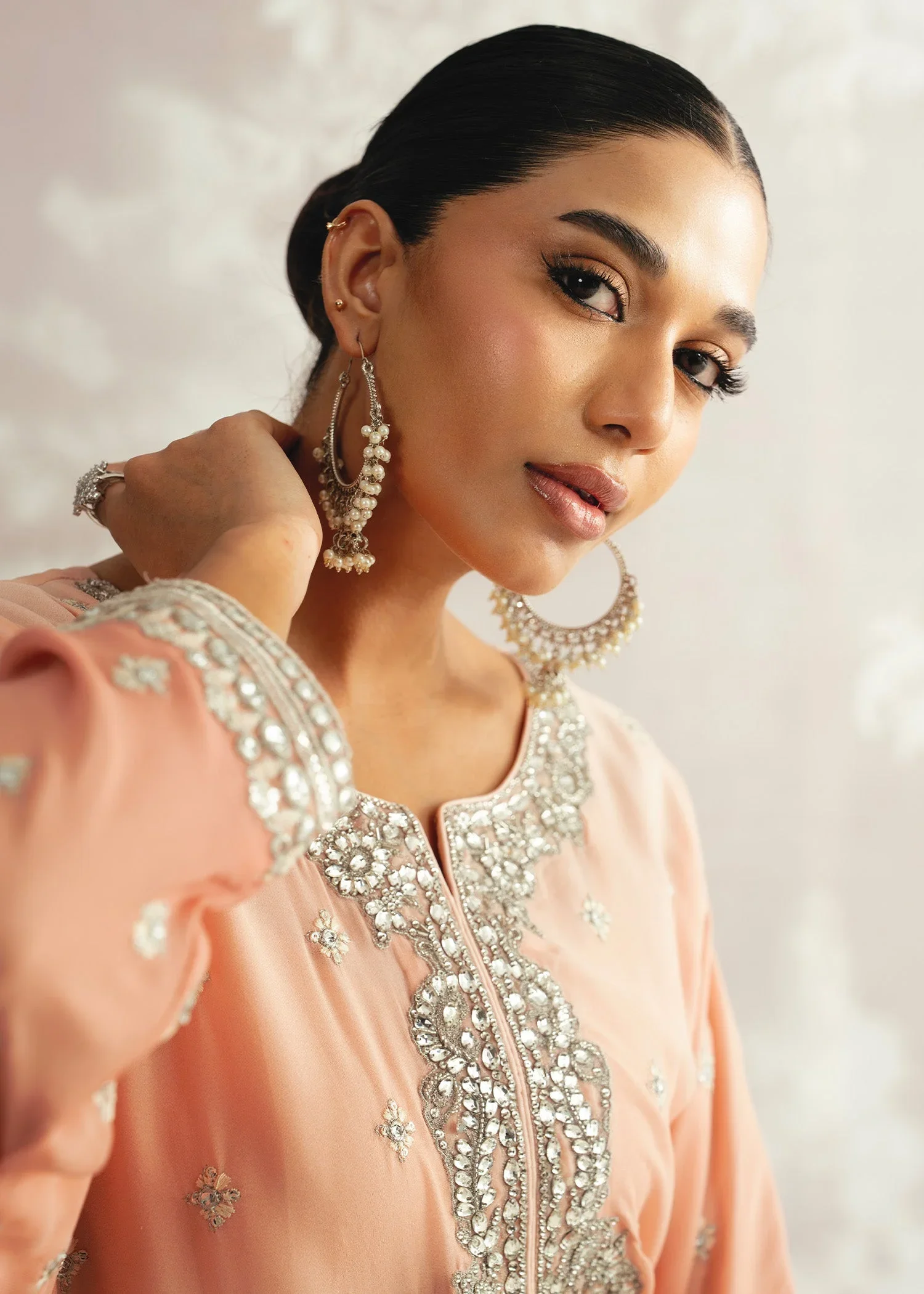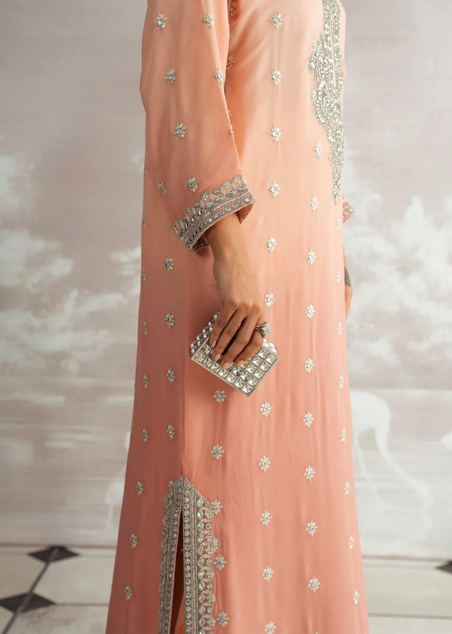 Delicately radiant, Mehrnaz unfolds in soft pink shades, exuding a feminine charm that’s both timeless and elegant. Featuring a hand-embellished neckline and paired with a graceful plain spray dupatta, this Luxury Pret ensemble is a perfect harmony of subtle sophistication and artisanal brilliance.