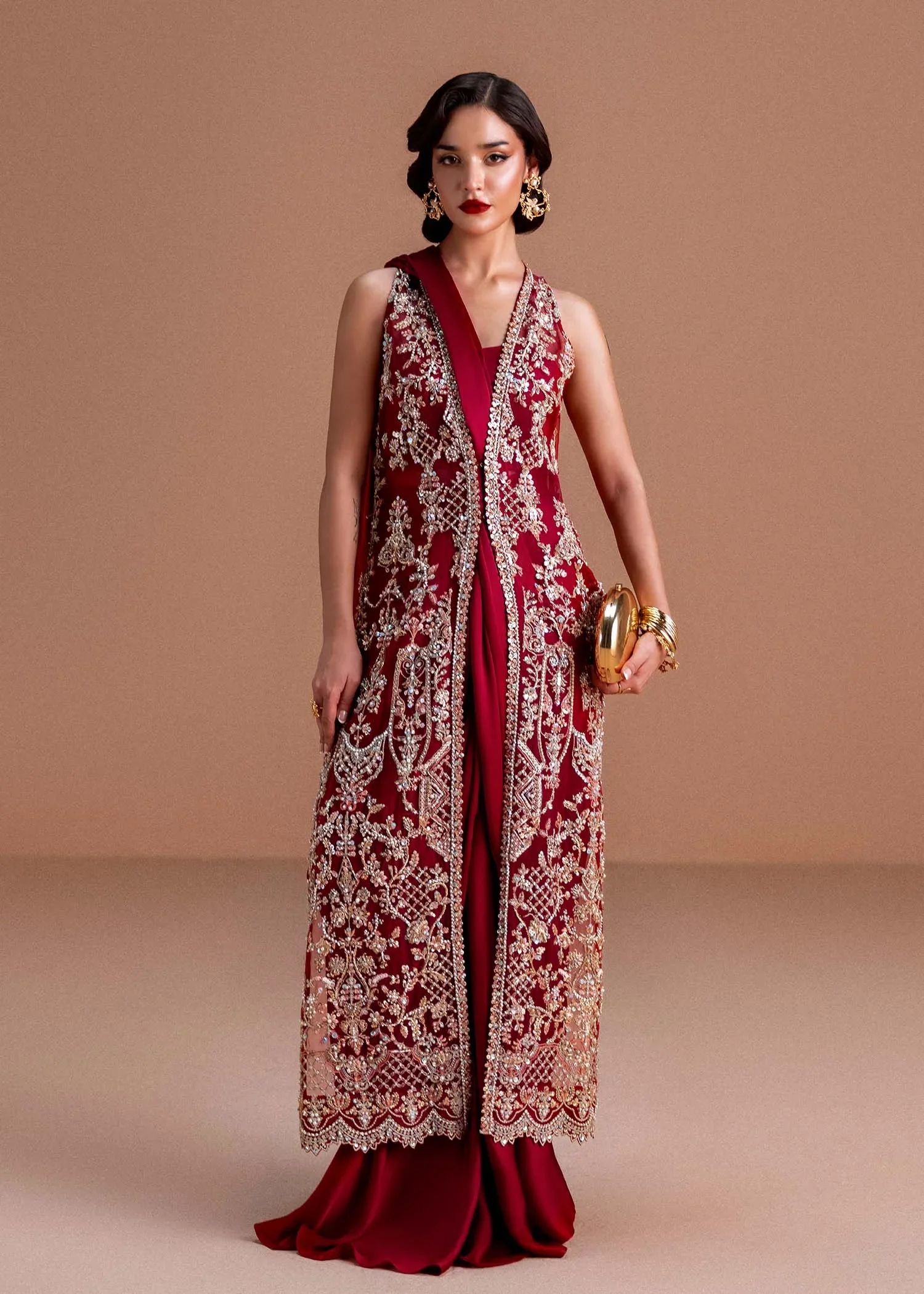 Turn heads with Naura by Kanwal Malik, a captivating ruby red saree dress designed to embody bold elegance and modern sophistication. This striking ensemble features a sheer Kathan organza open jacket, intricately hand-embellished with luxurious ada work, creating a rich interplay of texture, sparkle, and refined craftsmanship.