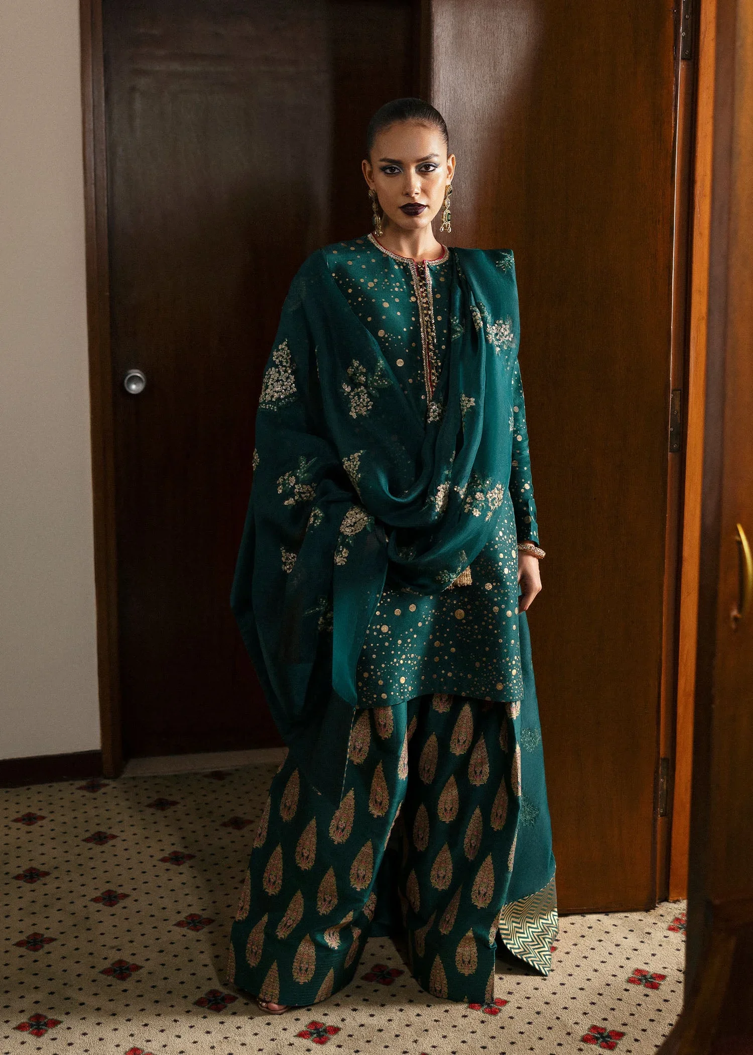 Step into refined elegance with Verdure, a mesmerizing emerald green luxury pret ensemble by Hussain Rehar, designed to blend contemporary style with timeless craftsmanship. The foil-printed raw silk short shirt features intricate Chand Sitara embellishments on the sleeves, adding depth, opulence, and artisanal finesse to the silhouette.