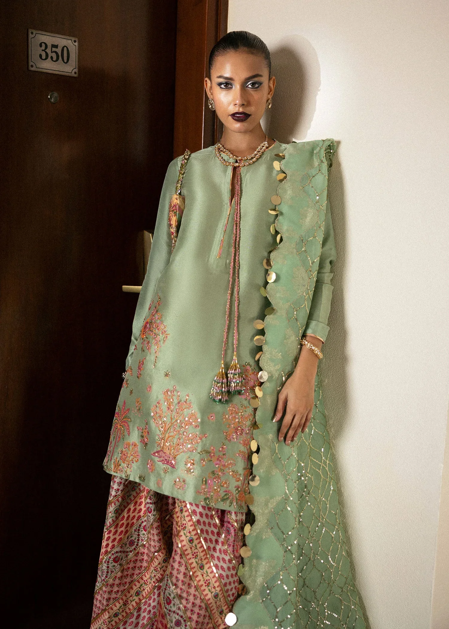 Paired with a multi-head organza dupatta, the ensemble gains a touch of ethereal lightness and graceful movement. The digital-printed raw silk shalwar, enhanced with exquisite gotta line detailing, introduces a striking contrast while maintaining cohesive elegance. Perfect for festive occasions, evening events, or celebratory gatherings, Viridity is a masterful blend of artistry, luxury, and modern charm, designed to leave a lasting impression.
